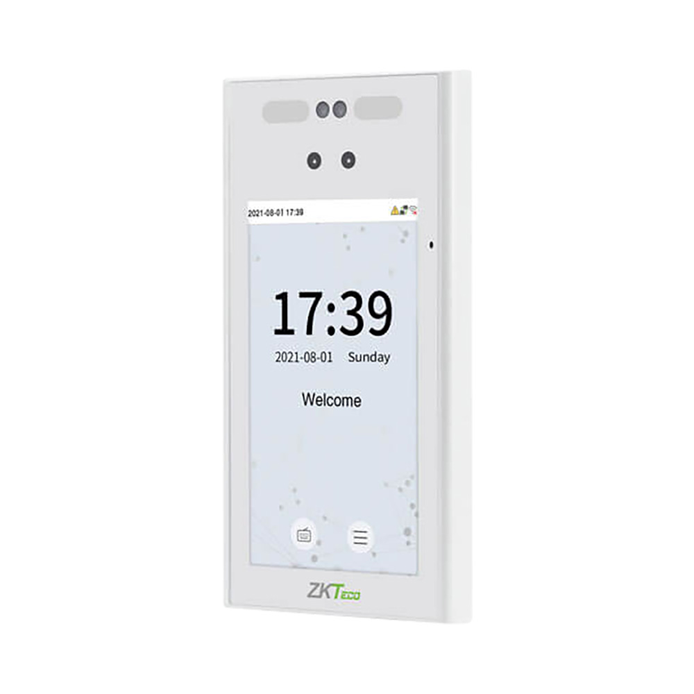 Терминал распознавания лиц, распознавание через маски, интеллектуальный алгоритм ZKTeco, 4-ядерный процессор ARM Cortex-A7. Рабочая температура -20 … +45 °C, класс защиты IP65.