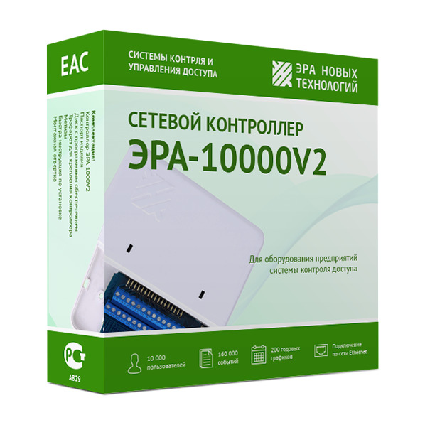 Сетевой контроллер «ЭРА-10000 v2» с подключением по сети Ethernet разработан компанией «Эра новых технологий» для обеспечения контроля доступа на объектах с численностью сотрудников не более 10000 человек. Он хранит в собственной памяти информацию о 160 000 событиях и сведения о 200 графиках проходов любой сложности. Устройство способно обслуживать одну полноценную точку прохода через интерфейс от Wiegand-4 до Wiegand-64 или две точки через Touch Memory. Идентификация пропусков происходит на основе Proximity карт или карт с чипом. Контроллер для сетевых СКУД «ЭРА-10000 v2» поставляется вместе с фирменным бесплатным программным обеспечением «ЭНТ - контроль доступа». В ПО включены средства автоматизированного формирования отчётов и рассылки авторизованным лицам, программа интеграции с IP-видеосистемами сторонних производителей с возможностью просмотра фрагментов фиксации прохода. Все контроллеры оснащены выходами «открытый коллектор» для управления электромеханическими и электромагнитными замками, а также кнопкой выхода. Кроме того, он взаимодействует с турникетами, шлагбаумами, приводами ворот, картоприемниками.