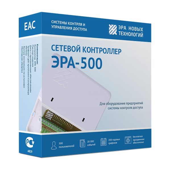Сетевой контроллер СКУД «Эра-500» с подключением по сети Ethernet, обеспечивает управления доступом в офисах или объектах с численностью сотрудников не более 500 человек. Он хранит в собственной памяти информацию о 30 000 событиях. Устройство способно обслуживать одну полноценную точку прохода через интерфейс от Wiegand-4 до Wiegand-64 или две точки через Touch Memory. Идентификация пропусков происходит на основе Proximity карт или карт с чипом. Выход «открытый коллектор» в приборе предназначен для управления электромеханическими и электромагнитными замками, кнопкой выхода. Кроме того, контроллер взаимодействует с турникетами (в том числе, с моделями, оснащенными картоприёмниками). «Эра-500» поддерживает 50 графиков прохода и 50 временных режимов для них. В комплект прибора входит бесплатное фирменное программное обеспечение, которое можно доработать под индивидуальные требования пользователя. В ПО включены средства автоматизированного формирования отчётов и рассылки авторизованным лицам, программа интеграции с IP-видеосистемами сторонних производителей с возможностью просмотра фрагментов фиксации прохода.