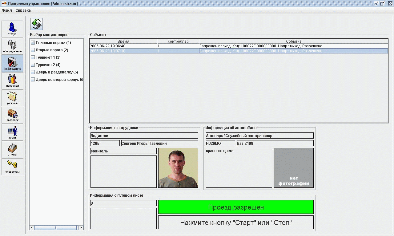Данный модуль программного обеспечения является дополнительным и позволяет наблюдать за происходящим в системе в режиме реального времени. В момент, когда сотрудник запрашивает разрешение прохода, на мониторе высвечивается его карточка учета с фотографией. Свои идентификационные карточки появляются на мониторе и при запросе проезда автомобиля. Установка подобного дополнительного модуля позволяет более тщательно осуществлять контроль доступа на предприятие.