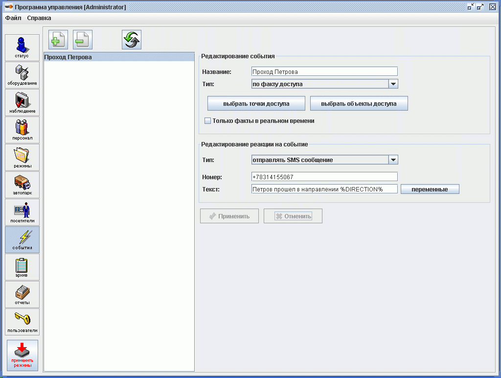 Количество соответствий «событие-реакция» не ограничено. Sigur обрабатывает события как в реальном времени, так и накопленные в автономном режиме.
