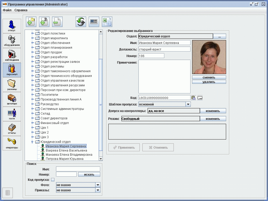 - ведение картотеки персонала, а также функции синхронизации данных о персонале по сторонним системам и базам данных