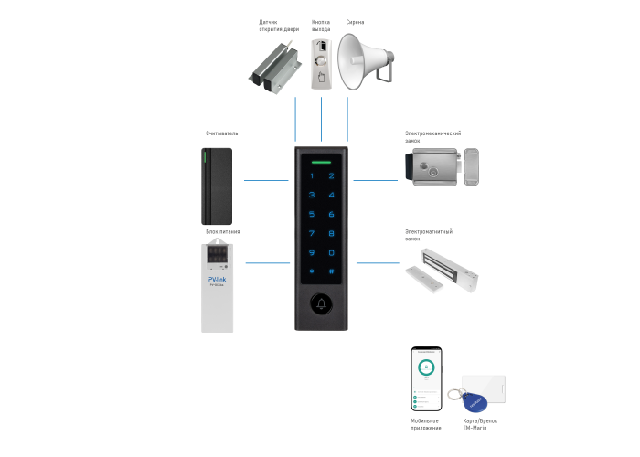 Поддержка до 1000 пользователей Встроенный считыватель Em-Marin Сенсорная клавиатура с умной синей подсветкой Настройка, управление, администрирование, выдача временных паролей в приложении Smart Life | Tuya Smart Поддержка всех типов электрозамков Работа в режиме шлюза Тревожные вход/выход Управление внешним дверным звонком Может использоваться в качестве считывателя Всепогодное исполнение в пластиковом корпусе IP66