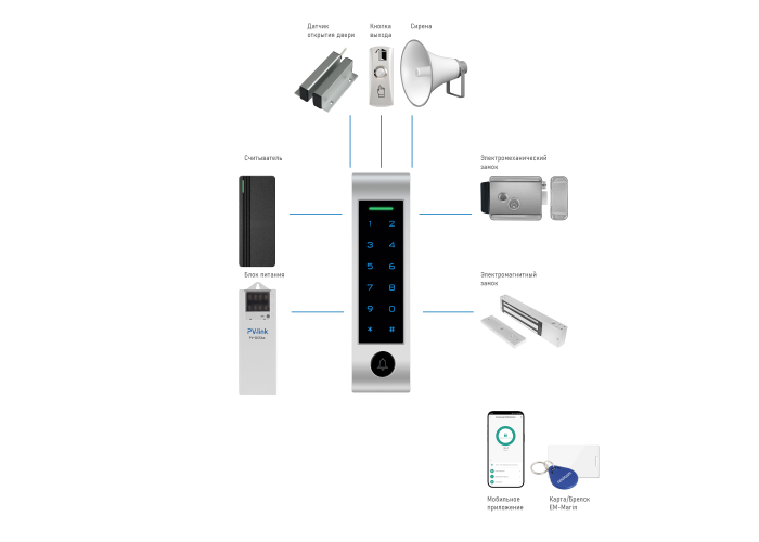 Поддержка до 1000 пользователей Встроенный считыватель Em-Marin Сенсорная клавиатура с умной синей подсветкой Настройка, управление, администрирование, выдача временных паролей в приложении Smart Life | Tuya Smart Поддержка всех типов электрозамков Работа в режиме шлюза Тревожные вход/выход Управление внешним дверным звонком Может использоваться в качестве считывателя Антивандальное исполнение IP66