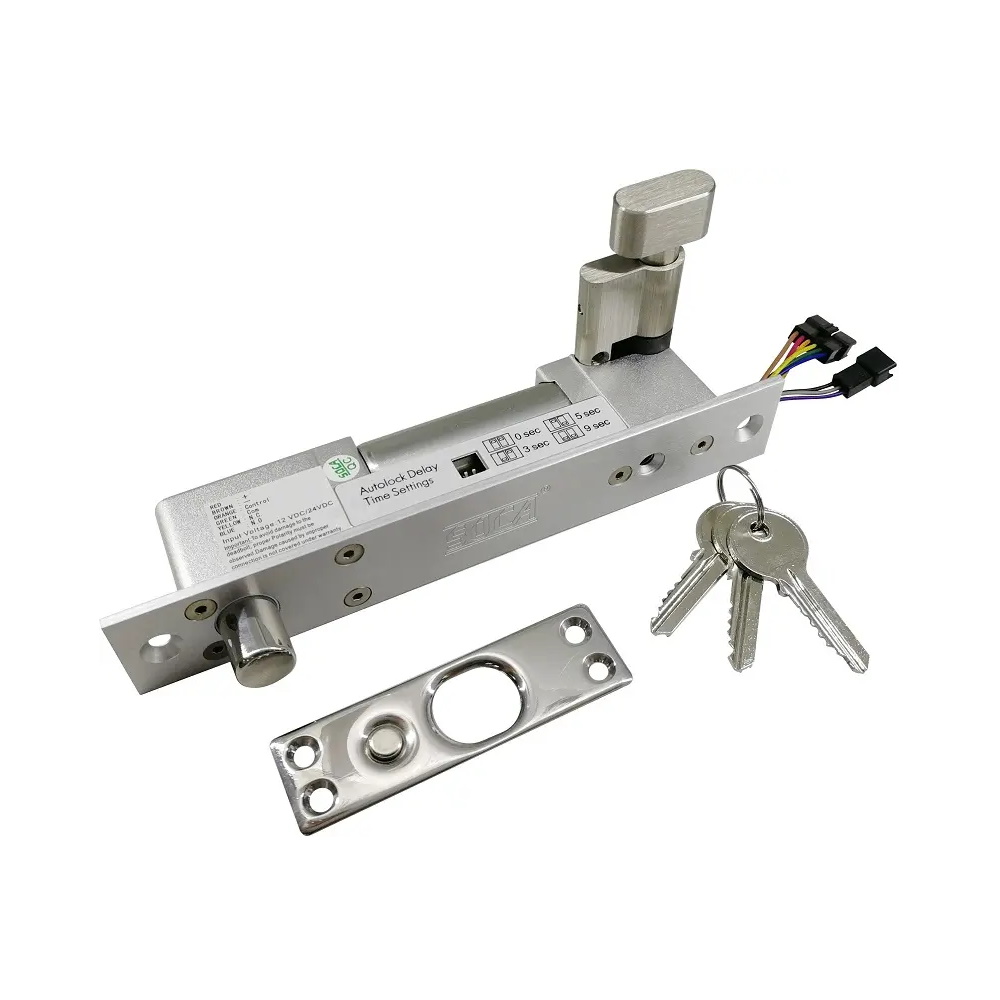 Врезной соленоидный электромеханический замок Н.З. с личинкой (3 ключа). Сила удержания 1200кг. Встроенный датчик положения двери и датчик положения замка Н.О./Н.З. Регулируемое время закрытия двери: 0/3/5/9 сек. Питание: DC 12В, 880мA. Автоматическое открытие при подаче напряжения. Габариты: 200 х 32,5мм