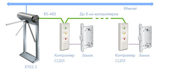 В электронной проходной к встроенному в стойку турникета контроллеру можно подключить до 8-ми контроллеров СКУД PERCo-CL201.1 со встроенным считывателем, что обеспечивает экономичное оборудование 8-ми помещений системой контроля доступа.