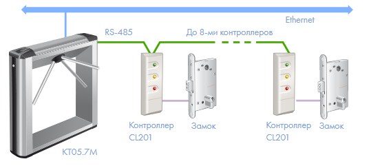 В электронной проходной к встроенному в стойку турникета контроллеру можно подключить до 8-ми контроллеров СКУД PERCo-CL201.1 со встроенным считывателем, что обеспечивает экономичное оборудование 8-ми помещений системой контроля доступа.