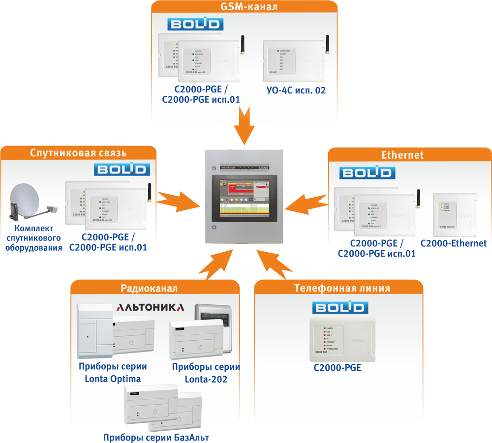Функциональные возможности КСПИ "ЭГИДА" Для диспетчеров пожарных пультов: Отображение текущего состояния объектов пожарной охраны на экране рабочего места Звуковая сигнализация при приеме сигнала сработки пожарной автоматики на объекте Расширенные сведения об объекте охраны: его местоположение, контактная информация о собственнике и обслуживающей организации, расположение элементов на поэтажном плане в карточке объекта. Из карточки объекта возможно управление элементами объекта и обработка тревог Настраиваемые графические элементы на экране ППО Формирование отчета за дежурную смену Для обслуживающей организации: Обеспечивает приём, расшифровку и отображение сигналов "ВНИМАНИЕ", "ПОЖАР-1", "ПОЖАР-2", "ПУСК", "АВТОМАТИКА ОТКЛЮЧЕНА", "НЕИСПРАВНОСТЬ", "АВАРИЯ", "ПОТЕРИ СВЯЗИ" с приборами Просмотр состояния всех объектов и логических элементов на интерактивном поэтажном плане объекта и карте местности Периодический опрос параметров – температуры, влажности, задымлённости, запылённости и уровня напряжения адресных тепловых, дымовых и других типов извещателей и накопление статистики превышения порогов показателей, отказов, неисправностей и ложных срабатываний Система отчетов с возможностью отображения статистики контролируемых параметров Для собственников объекта и инсталляторов систем передачи извещений: Приём извещений с объектов и систем передачи извещений с использованием протоколов Ademco Contact ID, SIA(DC-09), SMS Эгида-3, Орион, Орион ПРО, по беспроводным каналам сотовой связи GSM/GPRS, локальной сети Ethernet на ППО "Эгида" и по радиоканалу Криптографическое закрытие передаваемой информации Надежная передача извещений по резервному маршруту Приём извещений с объектов возможен по следующим каналам связи: Радиоканал на частоте 150 МГц или 450 МГц с использованием сертифицированных для работы в системах пожарного мониторинга приборов компании Альтоника "Lonta-Optima", "Lonta-202" и приборов серии "БазАльт" Канал сотовой связи GSM (GPRS), GSM SMS, GSM CSD, GSM Contact ID Коммутируемая проводная телефонная линия Локальная сеть Ethernet Интерфейсная шина RS-485 и RS-232 Глобальная сеть Интернет Спутниковая связь КСПИ "Эгида" состоит из прибора пультового оконечного системы передачи извещений "Эгида" (или ППО СПИ "Эгида") для приёма извещений и осуществления противопожарного мониторинга, который устанавливается в пожарной части, а также зарекомендовавших себя модульных объектовых оконечных приборов "УО-4С" и "С2000-PGE" и "С2000-PGE исп.01", работающих в составе пульта "С2000М", блока сигнально-пускового "С2000-СП1" и резервированного источника питания РИП-RS, которые используются на объектах охраны. При использовании радиоканала могут применяться приборы передачи извещений систем "БазАльт", "Lonta-Optima" и "Lonta-202" компании "Альтоника". Допускается подключение приборов ИСО "Орион" к ППО СПИ "Эгида" по проводным каналам связи и протоколам "Орион" и "Орион ПРО" (без использования ПОО) с применением преобразователей протокола "С2000-Ethernet", USB-RS485 и др. Объектовые и пультовые устройства в составе КСПИ "Эгида" Приборы и модули ПОО СПИ "Эгида" производства компании "Болид" УО-4С исп.02 , С2000-PGE , С2000-PGE исп.01 (в составе КСПИ "Эгида" рассматриваются как модули модульно-блочного устройства состоящего из пульта контроля и управления охранно-пожарного "С2000М", блока сигнально-пускового "С2000-СП1", резервированного источн