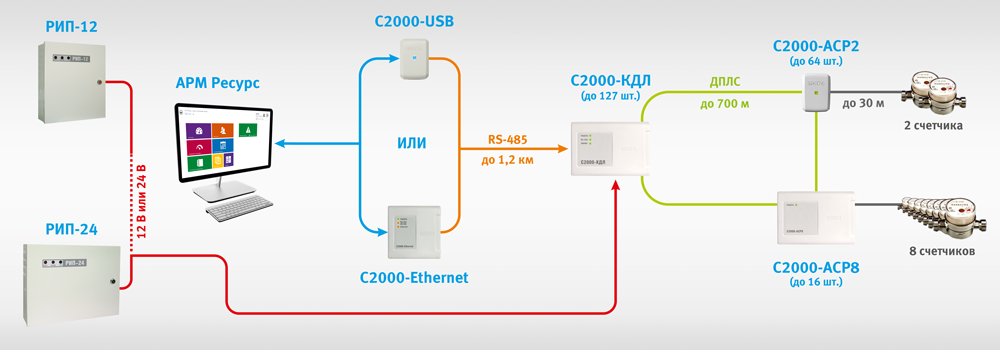 АСКУЭ "Ресурс" (Автоматизированная Система Контроля и Учёта Энергоресурсов) – это решение для удаленного автоматизированного сбора показаний приборов учёта ресурсов (воды, газа, тепла, электроэнергии (мощности)). АСКУЭ "Ресурс" от ЗАО НВП "Болид" позволяет хранить, передавать и обрабатывать информацию с приборов учёта ресурсов в режиме реального времени независимо от типа устройства и производителя. Точность передаваемых показаний подтверждена свидетельством об утверждении типа средств измерений (Госреестр №60424-15). Программная часть АСКУЭ "Ресурс" - АРМ "Ресурс", является локальной и устанавливается на диспетчерский терминал потребителя без "облачного" хранения данных и без абонентской платы. Информация о потребляемых ресурсах может передаваться в РСО, ЕИРЦ, ГИС ЖКХ, ЕИАС ЖКХ МО, энергосбытовые компании (XML 80020, XML 80020*, ASQ), выгружаться в программу 1С: Управление ЖКХ и в документы формата Excel. Дополнительно система позволяет: Избирательно воздействовать на должников путем частичного или полного ограничения в потреблении ЖКУ Предотвращать аварийные ситуации, связанные с возможными бытовыми утечками воды из инженерных сетей зданий Производить мониторинг температуры, относительной влажности и концентрации угарного газа воздуха помещений Позволяет использовать в своём составе магнитоконтактные охранные датчики Имеет интеграции с различными видедомофонными системами, специализированным ПО для управляющих компаний и сторонними системами АСКУЭ Преимущества АСКУЭ Ресурс: Отсутствие абонентской платы Установка на компьютер/сервер клиента Совместимость с любыми приборами учёта ресурсов, независимо от производителя Возможность бесплатной интеграции в АСКУЭ "Ресурс" новых приборов учета и интеграции самого "Ресурса" со сторонними системами Конкурентная цена Перечень оборудования для знакомства с системой . Информационный канал для импульсных счётчиков "С2000-АСР2": адресный счетчик расхода для 2-х приборов учета (счетчиков) "С2000-АСР8": адресный счетчик расхода для 8-ми приборов учета (счетчиков) "С2000-КДЛ": контроллер двухпроводной линии связи "С2000-ПИ", "С2000-USB", "USB-RS485": преобразователи интерфейсов RS-232 и USB в интерфейс RS-485 РИП-12, РИП-24: резервированные источники питания на 12 или 24 В постоянного тока ДПЛС: двухпроводная линия связи RS-485: интерфейс RS-485 ПК С АРМ "Ресурс": персональный компьютер с установленной программой АРМ "Ресурс" Импульсный счетчик: любой тип импульсного счётчика с частотой импульсов не более 70 имп/с для "С2000-АСР2" и 20 имп/с для "С2000-АСР8" Сбор показаний с импульсных счетчиков организуется с помощью адресных счетчиков расхода "С2000-АСР2" и/или "С2000-АСР8" и контроллера двухпроводной линии связи "С2000-КДЛ". "С2000-АСР2" и "С2000-АСР8" подсчитывают импульсы от счетчиков и по адресной двухпроводной линии связи (ДПЛС) передают данные о расходе на сетевые контролеры "С2000-КДЛ". Последние могут накапливать и хранить показания счетчиков и по запросу ПО АРМ "Ресурс" передавать данные на ПК для обработки и отображения информации. Персональный компьютер с программой АРМ "Ресурс" может быть включен постоянно или подключаться по мере необходимости. Структура информационного канала для цифровых счётчиков Сбор показаний цифровых счетчиков с интерфейсом RS-485 осуществляется путем подключения счетчиков к COM- или USB-порту компьютера с АРМ "Ресурс" че