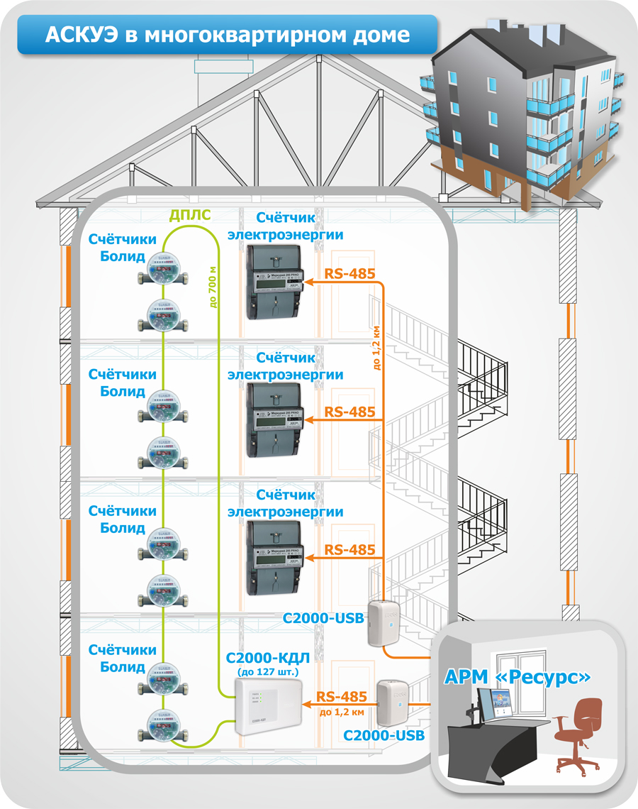 Различные варианты и описание применения АСКУЭ Подробнее... Рассмотрим основные варианты применения АСКУЭ «Ресурс» на примере многоквартирного жилого дома, коттеджного поселка и различных распределённых объектов. Многоквартирный дом АСКУЭ «Ресурс» позволяет собирать показания с различных типов счётчиков внутри жилого дома. Это могут быть, как разнообразные импульсные счётчики, так и большое количество различных цифровых приборов. АСКУЭ может применяться в домах абсолютно любой конфигурации. Обычно в каждой квартире устанавливается несколько счётчиков. Например, это могут быть импульсные приборы учета холодной\горячей воды и цифровой счётчик электроэнергии. Так же к ним могут добавляться счётчики газа и тепла. Отличительная особенность подобных объектов – большое количество различных счётчиков и большая длинна линий связи внутри дома. Компьютер с ПО АРМ «Ресурс» может находиться, как в служебном помещение самого здания, так и в управляющей организации. Основные преимущества АСКУЭ «Ресурс»: своевременное достоверное снятие показаний со всех счётчиков, установленных у жильцов в реальном времени; удобный WEB-интерфейс для абонентов (позволяет контролировать свои расходы, скачивать квитанции на оплату и т.д.); Коттеджный поселок Одно из типовых применений АСКУЭ – различные коттеджные поселки. АСКУЭ «Ресурс» может предложить своим клиентам интеграцию с приборами охранно-пожарного комплекса ИСО «Орион». «РЕСУРС» способен использовать уже существующие линии связи охранно-пожарных систем при работе с импульсными счётчиками, что, в свою очередь, позволяет существенно экономить на монтаже и прокладке линий связи при инсталляции системы. В данном пример представлен коттеджный поселок, в котором используется различное оборудование ЗАО НВП «БОЛИД», обеспечивающее охранно-пожарную безопасность каждого дома, контроль доступа и учет ресурсов на примере импульсных счётчиков и приборов С2000-АСР2\С2000-КДЛ. Основные преимущества АСКУЭ «Ресурс»: своевременное достоверное снятие показа