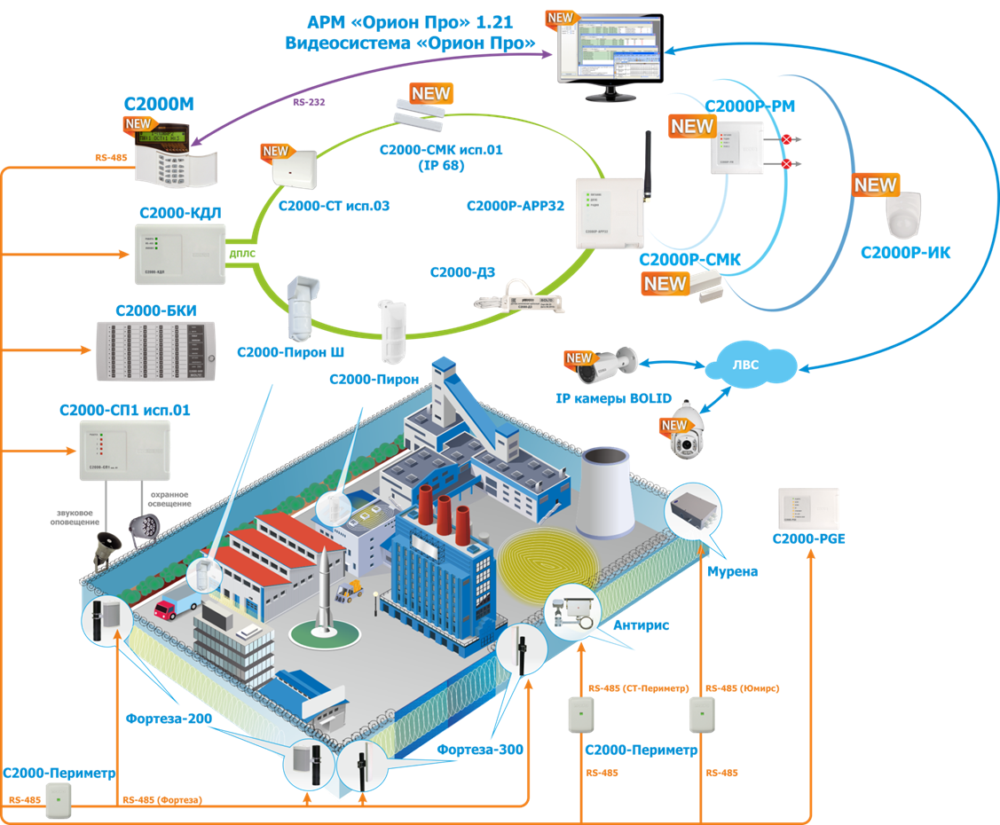 Подключение до 64 периметровых извещателей по интерфейсу RS-485 Типы периметровых извещателей: изготовитель ООО "СТ-Периметр": "Анчар-40", "Тантал-200/Предел-200", "Тантал-600/Предел-600", "Антирис 24-40", "Антирис 24-80", "Антирис 5.8-20" и "Антирис 5.8-40" изготовитель ЗАО "ЮМИРС": комбинированное средство обнаружения "Мурена" изготовитель ООО "Охранная техника": "Зебра-30/60/100", "Фортеза-50/100/200/300/500", "Формат-50/100", "Фантом-10/30", "Рельеф", "Форт-А", "Циклоп-30(10)", "FMW-3(1/2) PC", "Зебра-84(24)", "Циклоп-30(24)" у извещателей ООО "Охранная техника" серии "Зебра-30/60/100" обеспечена возможность взятия на охрану или снятия с охраны отдельных подзон изготовитель ООО "СТ-Периметр": извещатель "Виброн/Сечень" Обеспечено управление яркостью прожектора "Фосфор", изготовитель ООО "Охранная техника" от пульта "С2000М" Передача служебных и тревожных сообщений на пульт "С2000М" и АРМ "Орион Про" Централизованное управление постановкой на дежурство и снятием с дежурства периметровых извещателей Контроль вскрытия корпуса прибора Возможность настройки порога срабатывания периметровых извещателей из АРМ "Орион Про" Световая индикация состояния прибора, интерфейса RS-485