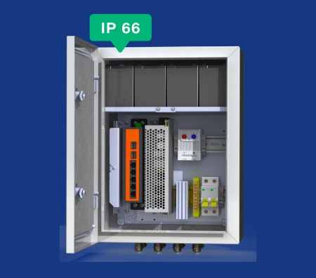 Комплектация: Двухполюсный защитный автомат 6А - 1 шт. Обогреватель 50Вт - 1 шт. Сдвоенный термостат - 1 шт. Блок бесперебойного питания 155Вт -1 шт. Аккумулятор 12В, 7А/ч - 4 шт. Промышленный управляемый коммутатор 4*PoE 802.3 af/at (бюджет 140 Вт), 2*SFP, 1*console port - 1 шт. Оптический кросс 4 порта SC/SM - 1 шт. Гермовводы 4*PG9, 4*PG13,5 -1 комплект. Цвет ral 7035 (серый)