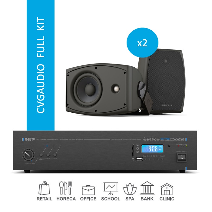 – комплект звукового оборудования и коммутации предназначен для помещений площадью до 50 m2 для создания качественной и функциональной системы фонового звука и голосового оповещения в различных коммерческих помещениях. Уровень защищенности акустики от проникновения внутрь влаги и пыли – IP44, благодаря чему АС могут быть установлены как в помещении, так и на улице (предпочтительно под навесом). Рекомендуется для установки в магазины, бутики, торговые комплексы, кафе, рестораны, бары, фитнес клубы, spa-салоны, салоны красоты, офисные помещения, переговорные и другие торговые и общественные помещения.