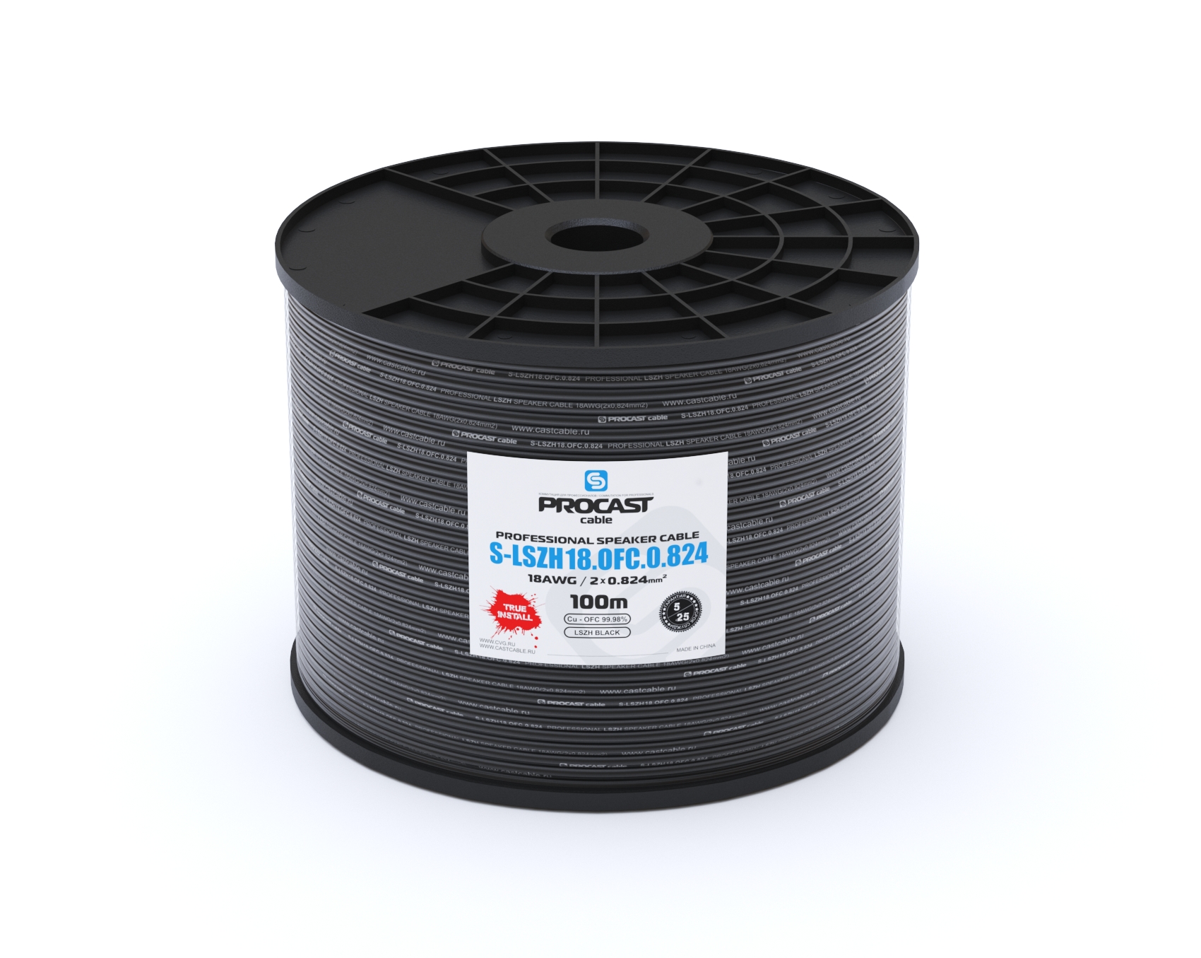 – профессиональный инсталляционный LSZH (безгалогеновый) спикерный (акустический) кабель с сечением жил 18AWG (2×0,824mm2) специально созданный для подключения акустических систем установленных в общественных помещениях. Кабель имеет двойную изоляцию – внешнюю LSZH безгалогеновую оболочку черного цвета и внутреннюю красно-черную изоляцию раздельно для каждой из двух жил. Пластикаты класса LSZH не распространяют горение, не содержат галогенов и не выделяют коррозионно-активных продуктов, что по современным общемировым нормативам является обязательным требованием к кабелю при его прокладке в общественных помещениях. S-LSZH 18.OFC.0,824 соответствует всем этим требованиям.