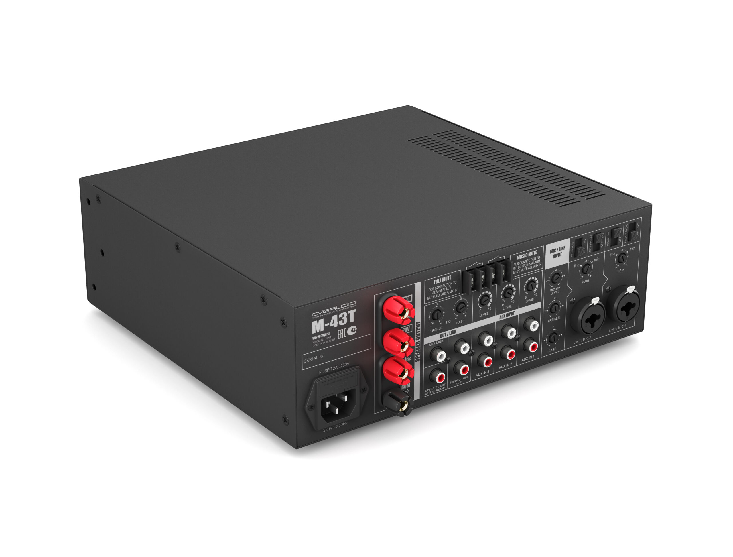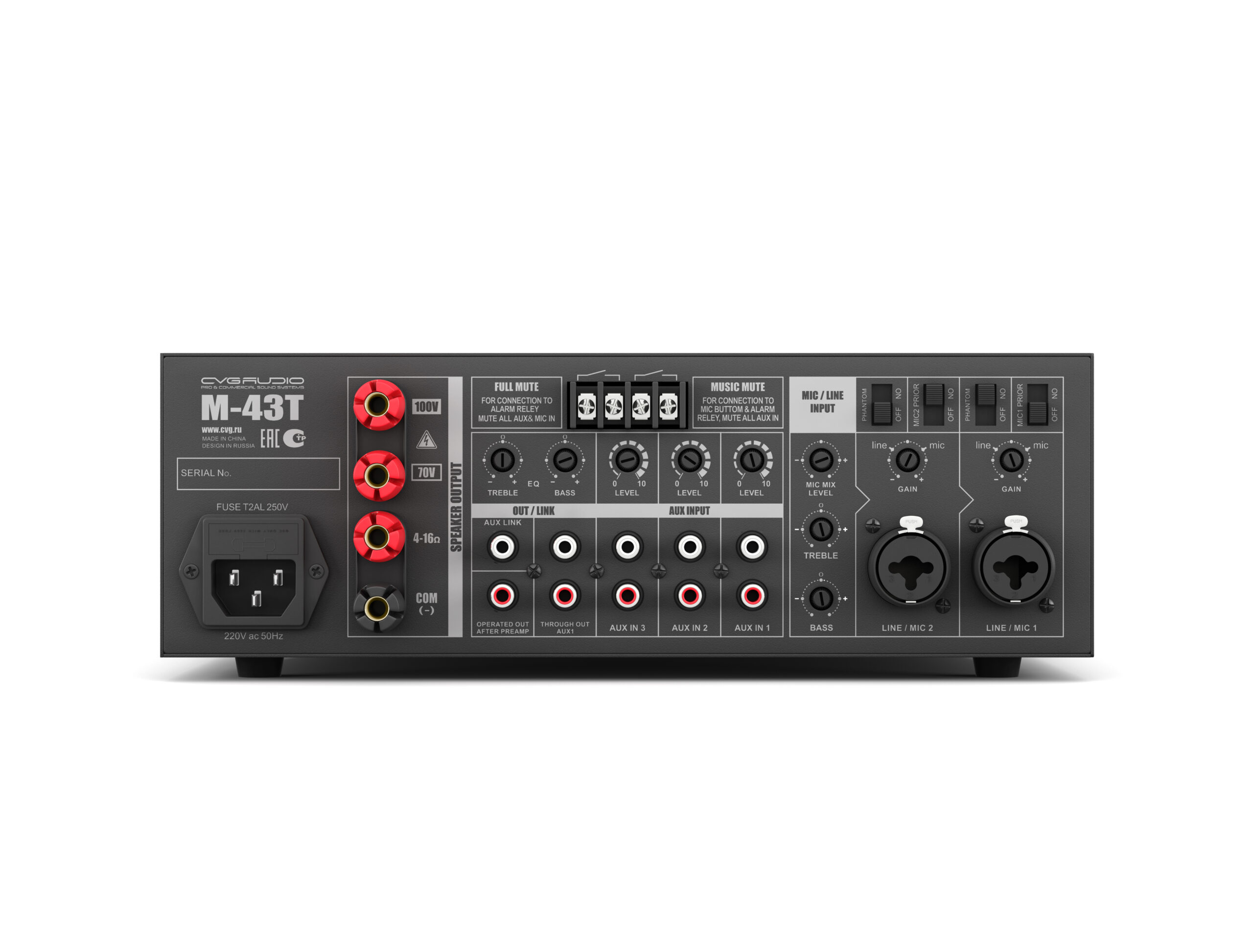 CVGaudio M-43T – профессиональный микшер – усилитель предназначенный для организации качественной трансляции фоновой музыки и речевого оповещения в торговых и общественных помещениях. Данная модель обеспечит отличное качество звучания и богатый функционал. Усилитель имеет мощность 40W и может работать как в трансформаторном 100V (основной режим работы), так и низкоомном 4-16ohm. Усилитель одноканальный, подключаемые к нему стереофонические линейные сигналы от источников звука корректно суммируются и на акустические системы подается уже усиленный монофонический сигнал, более корректный для систем фонового звука и Public Address (обеспечивающий более равномерное звуковое покрытие). У CVGaudio M-43T три линейных входа выполненные на разъемах 2RCA с возможностью выбора активного с помощью селектора на лицевой панели. Каждый вход имеет индивидуальную настройку чувствительности.