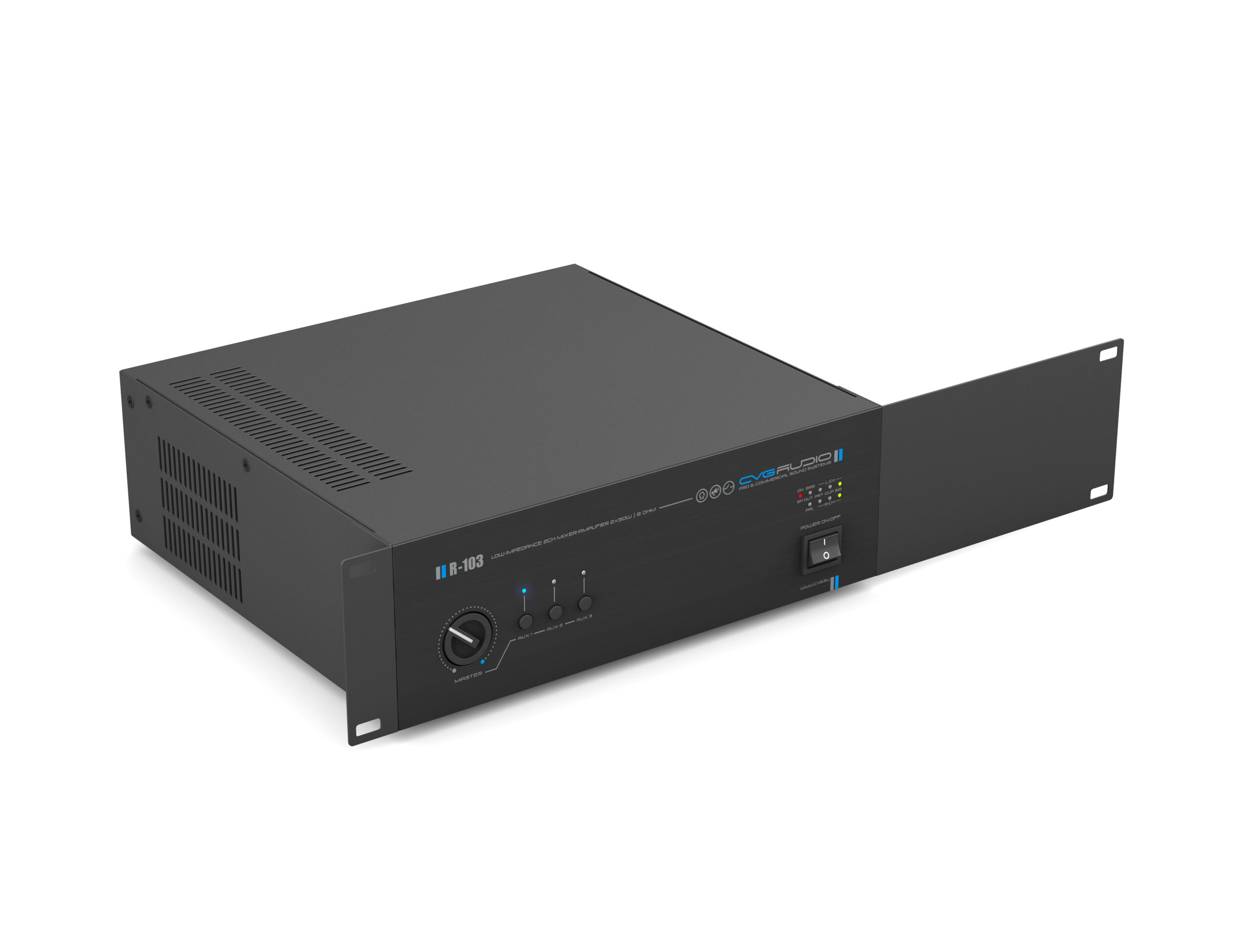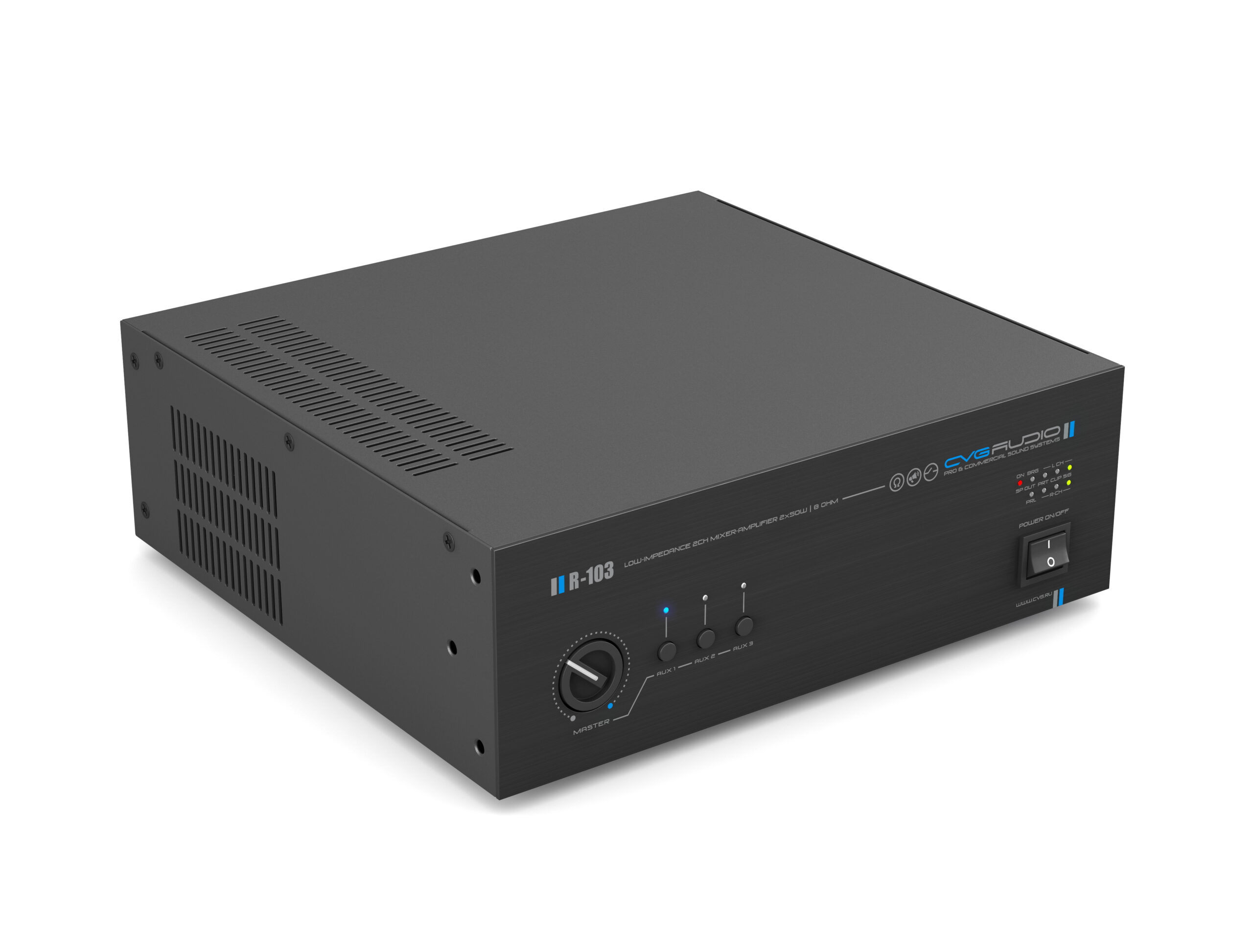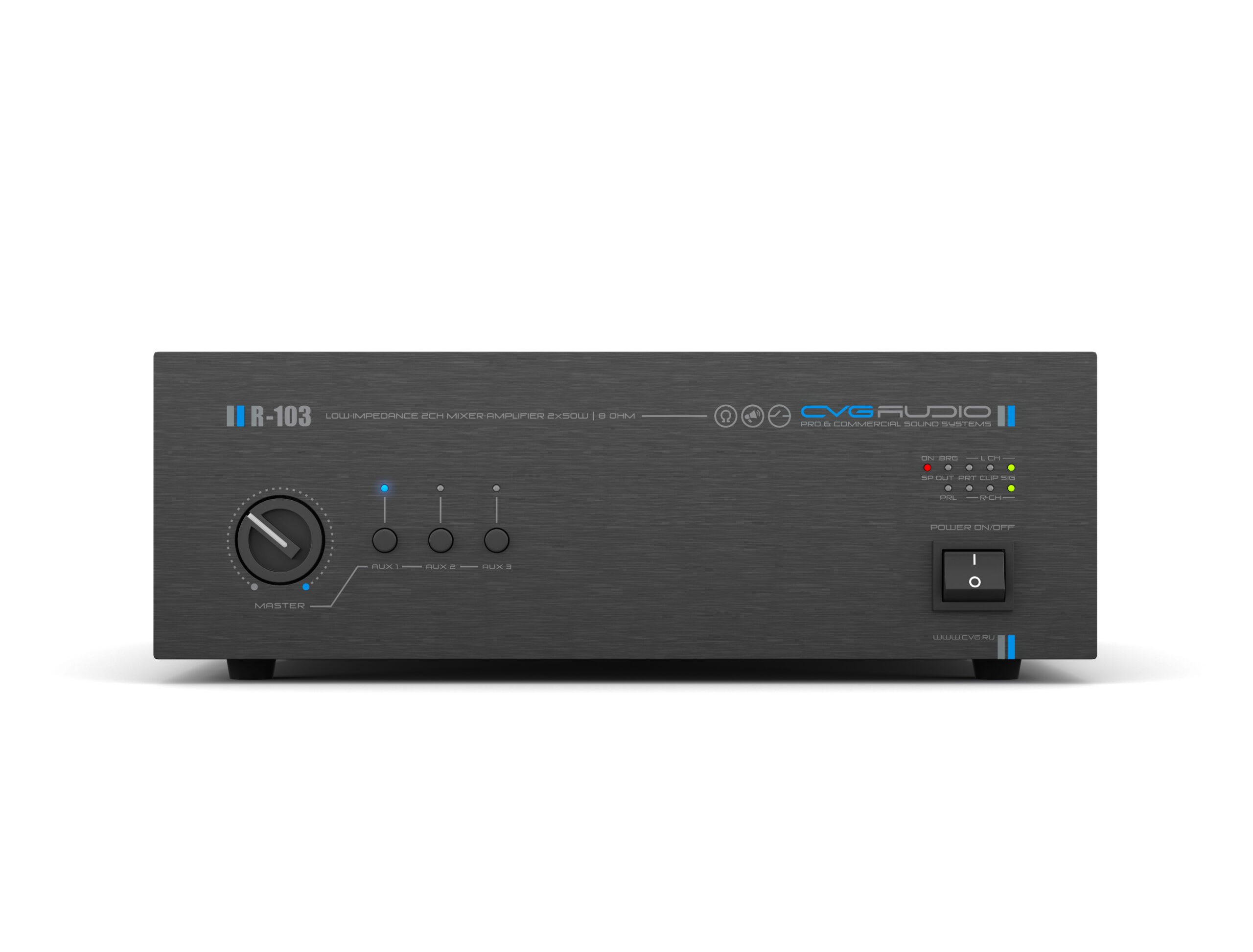 CVGaudio R-103 -профессиональный миниатюрный микшер-усилитель для низкоомных (low-impedance) систем фонового звука в торговых, общественных и прочих помещениях, где требуется высокое качество воспроизведения музыки, богатый функционал и компактный размер усилителя. Мощность усилителя 2х50W при нагрузке 8ohm и 2х75W при нагрузке 4ohm. Корректный диапазон сопротивлений нагрузки для данной модели от 4 ohm до 8ohm. Усилитель может работать в трёх режимах – stereo/parallel/bridge. В режиме Bridge сопротивление нагрузки должно быть не меньше 8ohm, при этом мощность усилителя будет 150W. CVGaudio R-103 имеет три линейных не балансных входа на разъемах 2RCA с селектором выбора активного входа (по умолчанию при включении активный – Aux in 1).