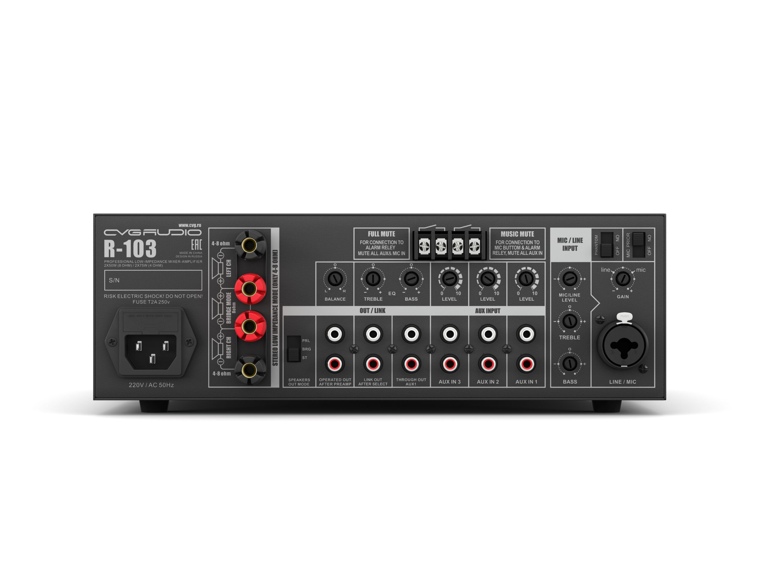Для каждого линейного входа предусмотрена индивидуальная настройка чувствительности и общий на три линейных входа двухполосный эквалайзер. Также предусмотрен один микрофонный вход XLR/TRS с возможностью включения фантомного питания, активацией приоритета над другими линейными и отдельным от линейных входов двухполосным эквалайзером. На лицевую панель усилителя вынесена кнопка включения, три кнопки выбора линейного входа со светодиодной индикацией и регулятор общей громкости Master. Все прочие регуляторы управления вынесены на заднюю панель для предотвращения не санкционированного доступа к изменению настроек. Для подключения внешних активных звуковых устройств в CVGaudio R-103 предусмотрены выходы – Operated out после предусилителя, Link out – после селектора каналов (до предусилителя) и Through out сквозной выход с первого входа Aux in 1.