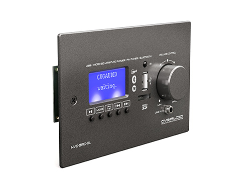 – настенный внешний регулятор громкости и модуль источника сигнала в черном цвете. Модуль источника сигнала состоит из mp3/flac плеера с возможностью воспроизведения треков с подключаемых USB и microSD флешь накопителей объемом до 65Gb, FM тюнера с возможностью подключения внешней антенны и Bluetooth приемника для воспроизведения контента с подключаемых мобильных устройств. Помимо перечисленного панель имеет линейный входа на разъеме mini-TRS. Для подключения панели к усилителю рекомендуем использовать кабель типа “витая пара” CAT5E/CAT6. Максимальное удаление от усилителя – 50m. Модуль может как встраиваться в полые стены из гипсокартона и других материалов, так и устанавливаться накладным способом.