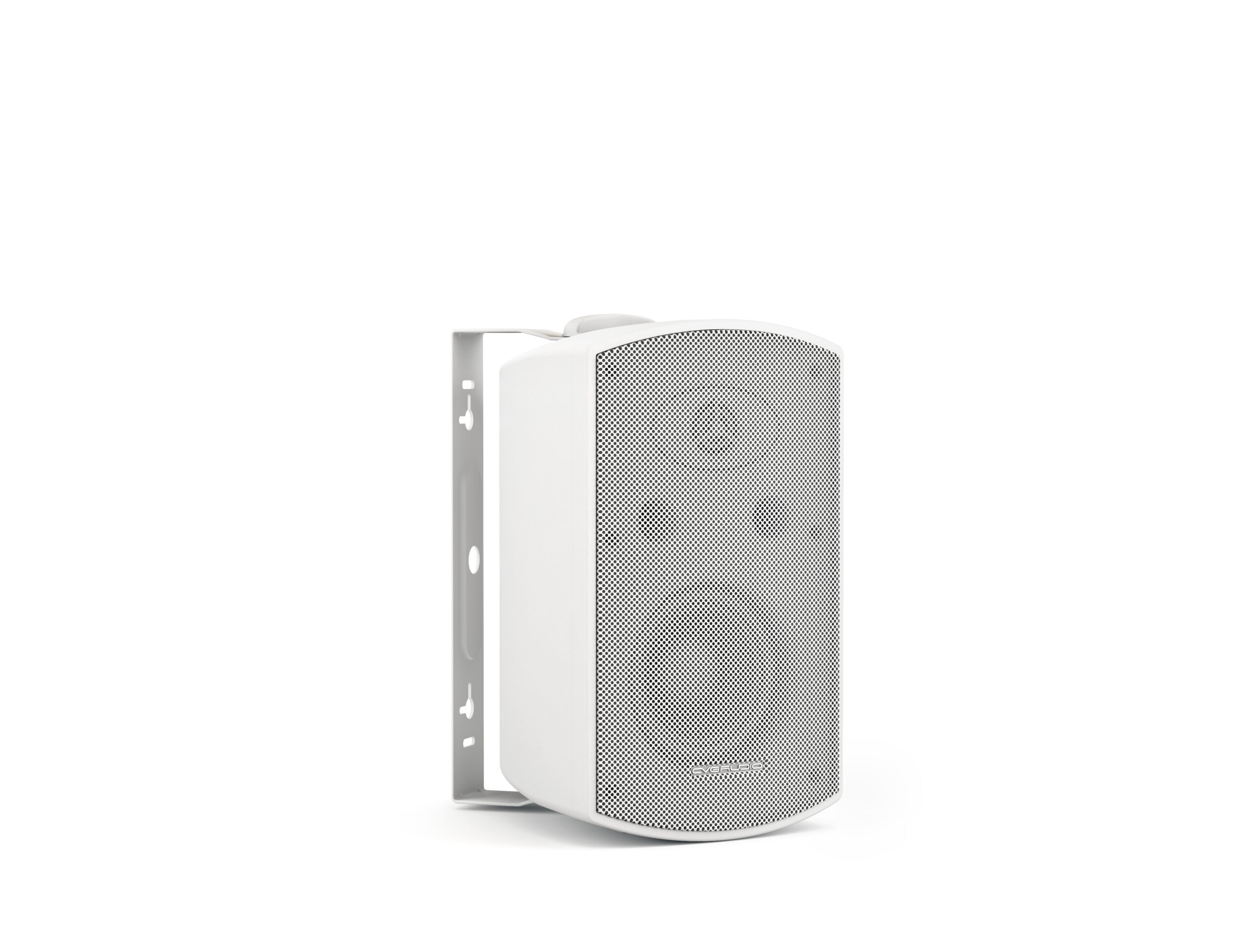 – качественные двухполосные акустические системы для трансляции фоновой музыки. Имеют современную, оригинальную форму корпуса, изготовленного из белого ABS пластика стойкого к воздействию пыли, влаги и солнечного света. Данную модель рекомендовано использовать только внутри помещений. На лицевой стороне расположены два фазоинвертора, в купе с качественным 4” вуфером (низкочастотным динамиком) из полипропилена с резиновым подвесом и мощной магнитной системой, обеспечивает, не смотря на небольшой размер диффузора, хорошее, уверенное звучание низких частот. Мощный купольный твитер – высокочастотный динамик, размером 1” изготовлен из шелка и отлично справляется с воспроизведением высоких частот. В результате акустическая система звучит сбалансировано и комфортно. Лицевая панель динамика скрыта защитной алюминиевой сеткой окрашенной в цвет корпуса.