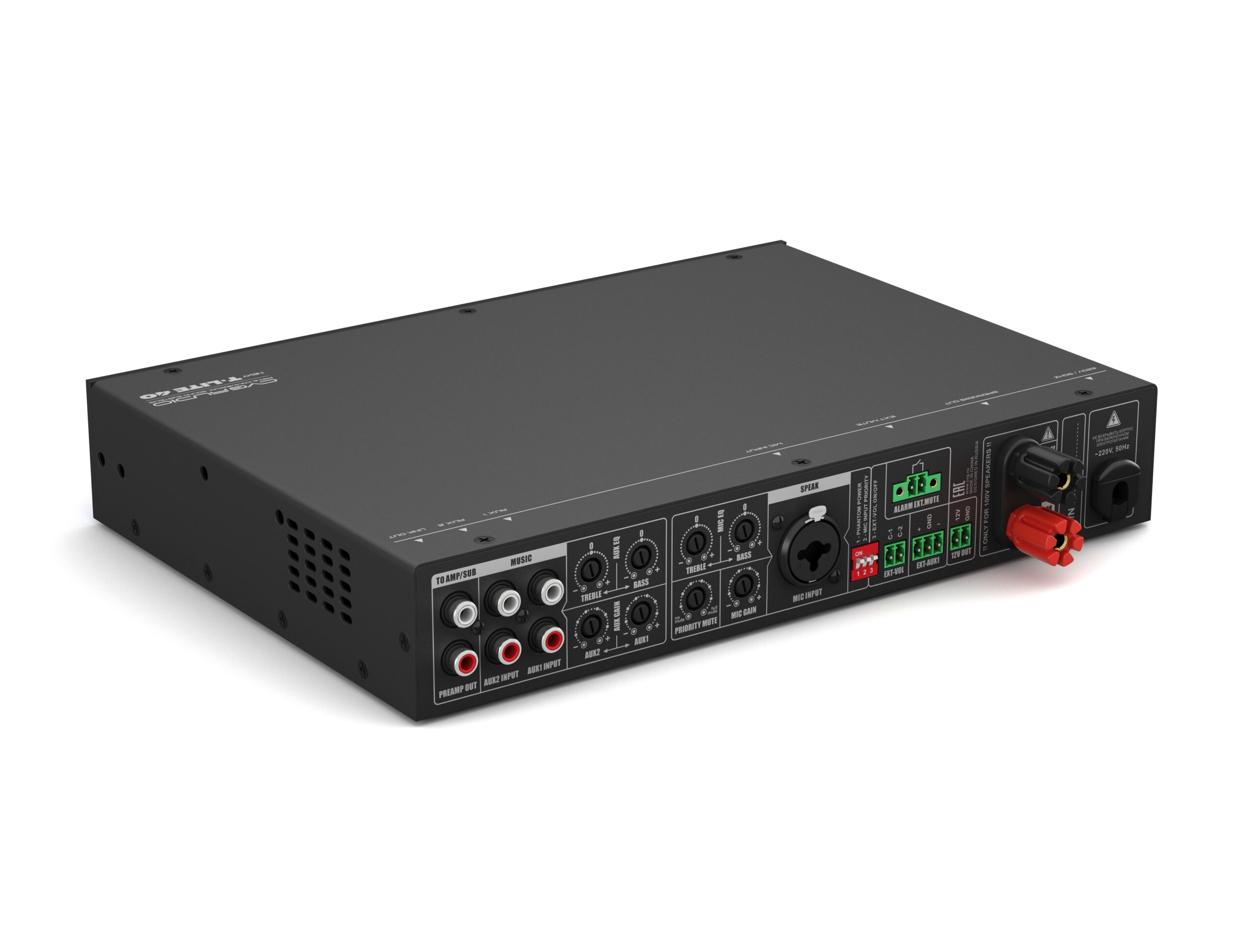 Профессиональный микшер-усилитель 40W/100V, D-class, 2 Aux-in, Mic in, подключение внешних панелей управления, 1U