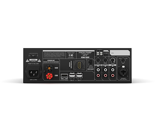 CVGAUDIO MCplayer 8T работает только с 100V акустическими системами, возможность работы с low-IMPEDANCE акустикой (4/8/16ohm) не предусмотрена. Мощность усилителя – 80W/100V. Усилитель выполнен в небольшом металлическом настольном корпусе. При необходимости установки в монтажную стойку – доступны опциональные рековые “уши”. В этом случае высота устройства будет – 2U. Усилитель имеет пассивное конвекционное охлаждение. Снабжен всеми необходимыми видами защиты – перегрузка, перегрев, короткое замыкание, предохранитель по питанию.