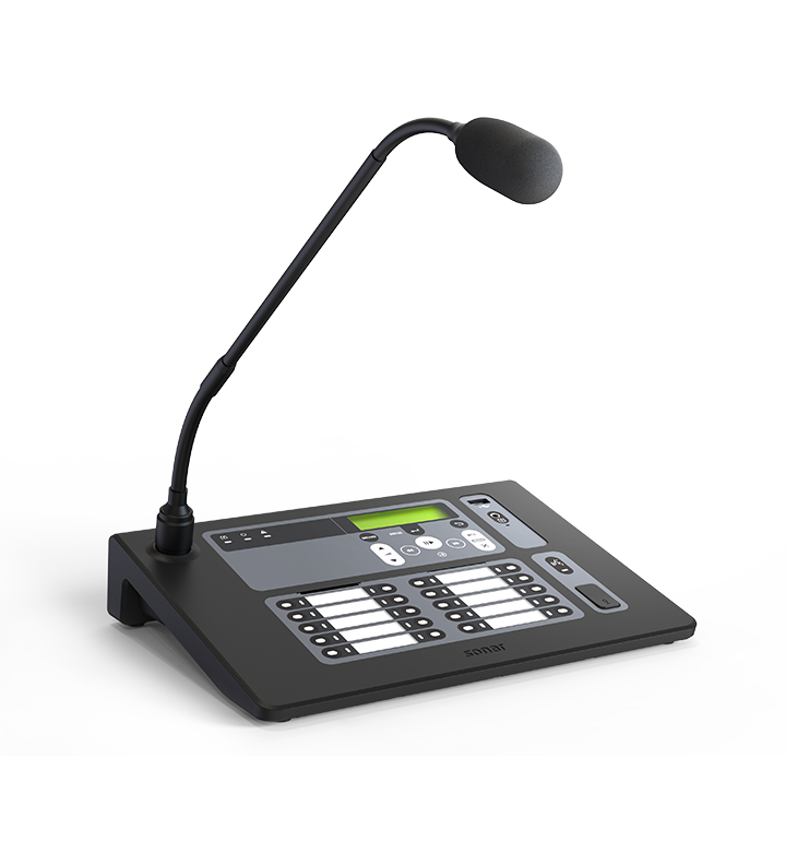 Пульт микрофонный Sonar SRM. Sonar SRM-7020С: 20 зон, подключение к моноблокам SPM-C по интерфейсу DAP, доп. вход питания 24 В, встроенный MP3/FM-плеер (воспроизведение файлов только с внешнего USB-флэш-накопителя), линейный вход