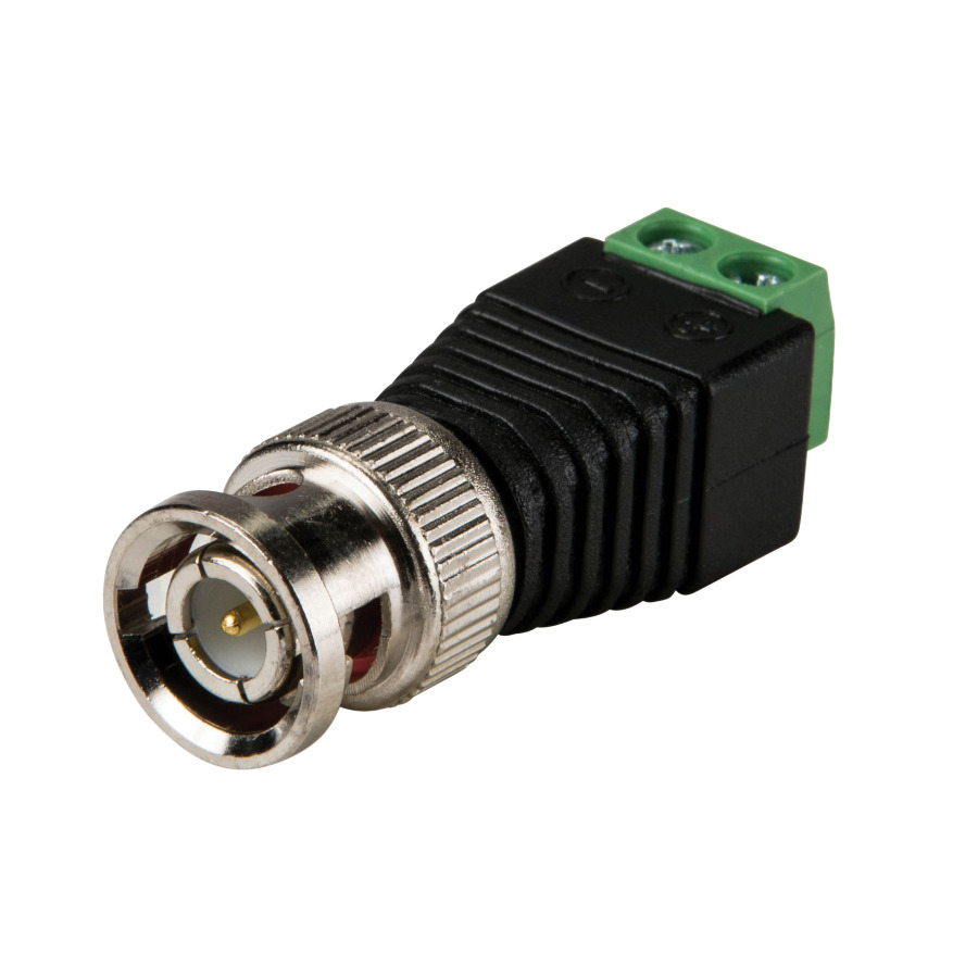 Разъем BNC с клеммной колодкой, под винт, предназначен для подключения видеосигнала видеокамер к устройствам передачи и приема, по кабелю типа "витая пара". Характеристики: напряжение питания, номинальное, В - 12...24 ±25%; Ток, максимально допустимый, А - 0,5; Рабочая температура - -50...+60°C."