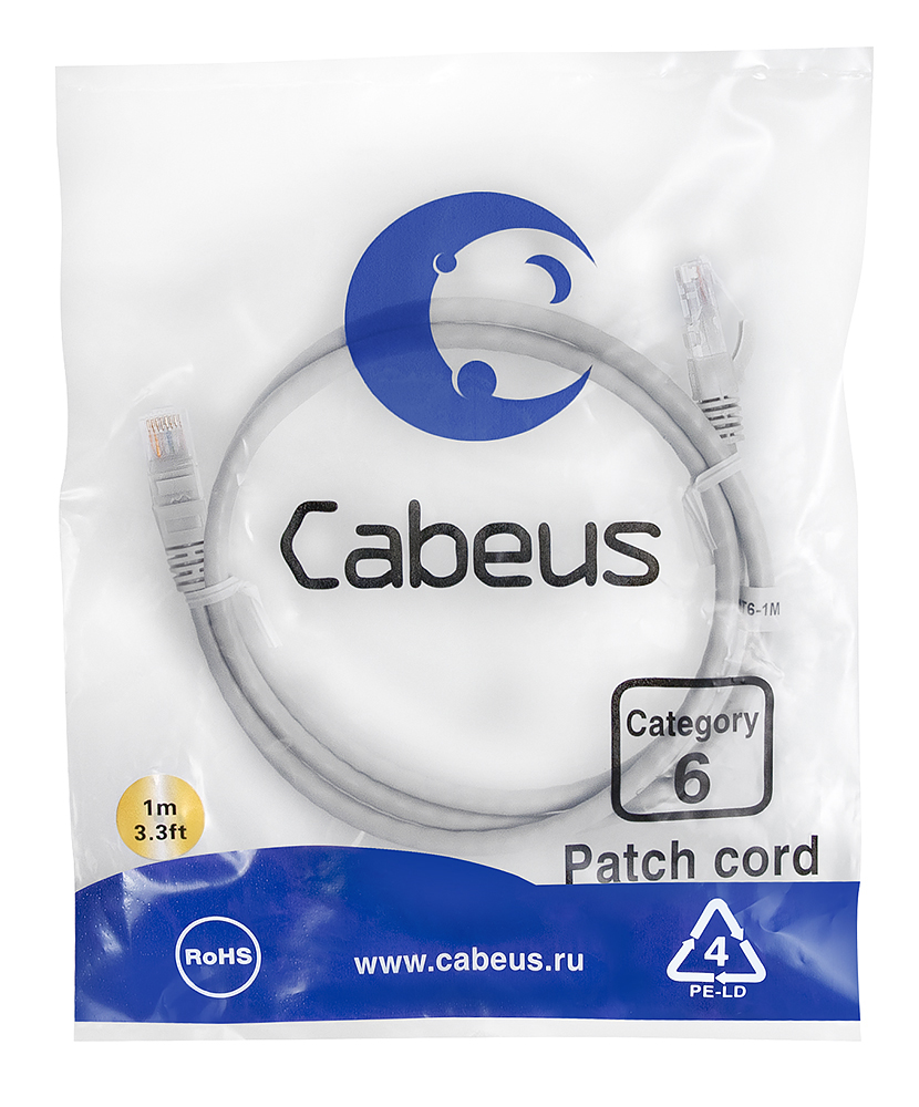 Cabeus PC-UTP-RJ45-Cat.6-1m Патч-корд U/UTP, категория 6, 2xRJ45/8p8c, неэкранированный, серый, PVC, 1м