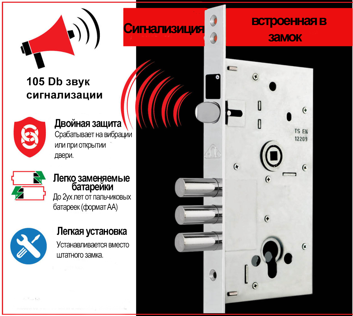 - В случаи поступления вибраций на дверь - в течении 8 секунд издает предупреждающий звук. Если в течении этого времени дверь не открывается при помощи ключа - срабатывает сигнализация 110 дцб.