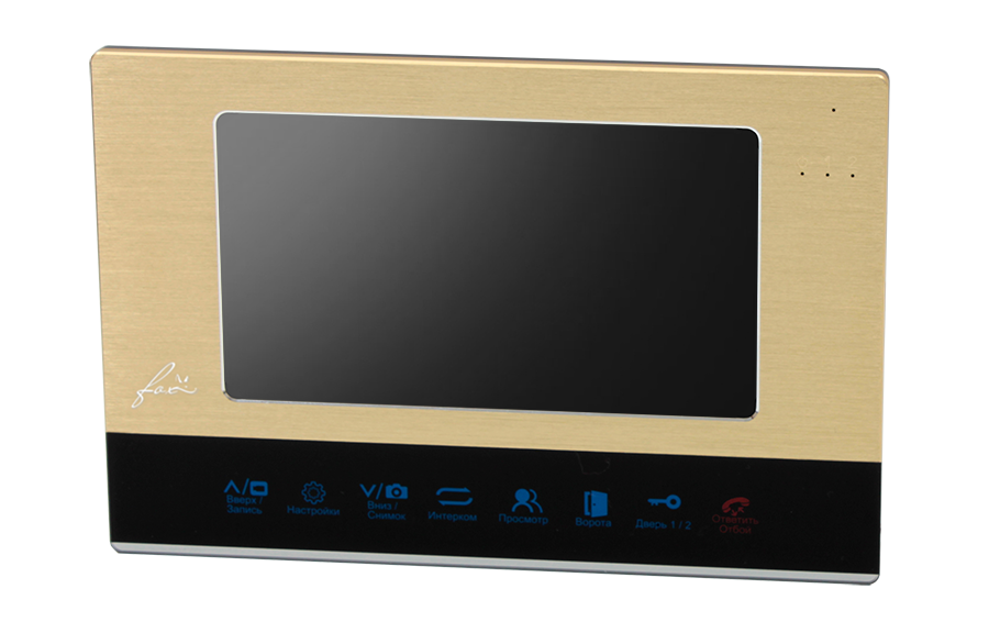 Стильный корпус, в золотом цвете, добавит нотки изысканности и подчеркнет стиль вашего интерьера. Данная модель обладает большим функциональными возможностями, доступны: "Интерком" - который позволяет построить систему из 6 мониторов, с возможностью переадресации входящего вызова на любой из них. По необходимости вы можете самостоятельно осуществлять вызов с монитора на монитор находящийся в одной системе. "Фоторамка" со сменой кадров в сопровождении с мелодией. Вы можете выбрать одну из 10 встроенных мелодий или добавить свою при помощи SD карты. Монитор поддерживает "micro SD" карту до 64Гб. SD карта необходима и для сохранения происходящих событий. Вы можете сами установить формат записи в режим "Фото" или "Видео", при этом запись может осуществляется, как при нажатии на кнопку вызова панели, так и по срабатыванию детектора движения, либо одного из подключенных датчиков тревоги. Наличие в мониторе SD карты также позволяет посетителю оставить для вас свое видеосообщение. Функция "Zoom". Вы можете увеличивать изображение даже при разговоре с посетителем онлайн. Предусмотрен дополнительный выход для управления воротами или, например, шлагбаумом. В домофоне есть возможность подключения 2-х видеокамер и 2-х видеопанелей, по желанию, вместо второй видеопанели можно подключить видеокамеру. Управление монитором осуществляется при помощи сенсорных кнопок. Видеодомофон подключается напрямую к сети 220В, использует стандартную 4-х проводную схему подключения с вызывной панелью, что удобно в большинстве случаев. При необходимости вы можете данный комплект подключить к подъездному домофону, подключение осуществляется через блок сопряжения соответствующий подъездной системе – координатный, либо цифровой. Видеодомофон FX-HVD77Е V2 Сапфир 7G Цветной TFT дисплей диагональю 7" дюймов (17,5 см) Поддерживает одновременно 4 формата видео TVI / CVI / AHD / Аналог на любом из каналов Разрешение 1024*600 Одновременно поддерживает стандарт видео 1Мп (720P) / 2Мп (1080P) и 960H (PAL / NTSC) Сенсорные кнопки "Hands Free" Собственное графическое меню на русском языке