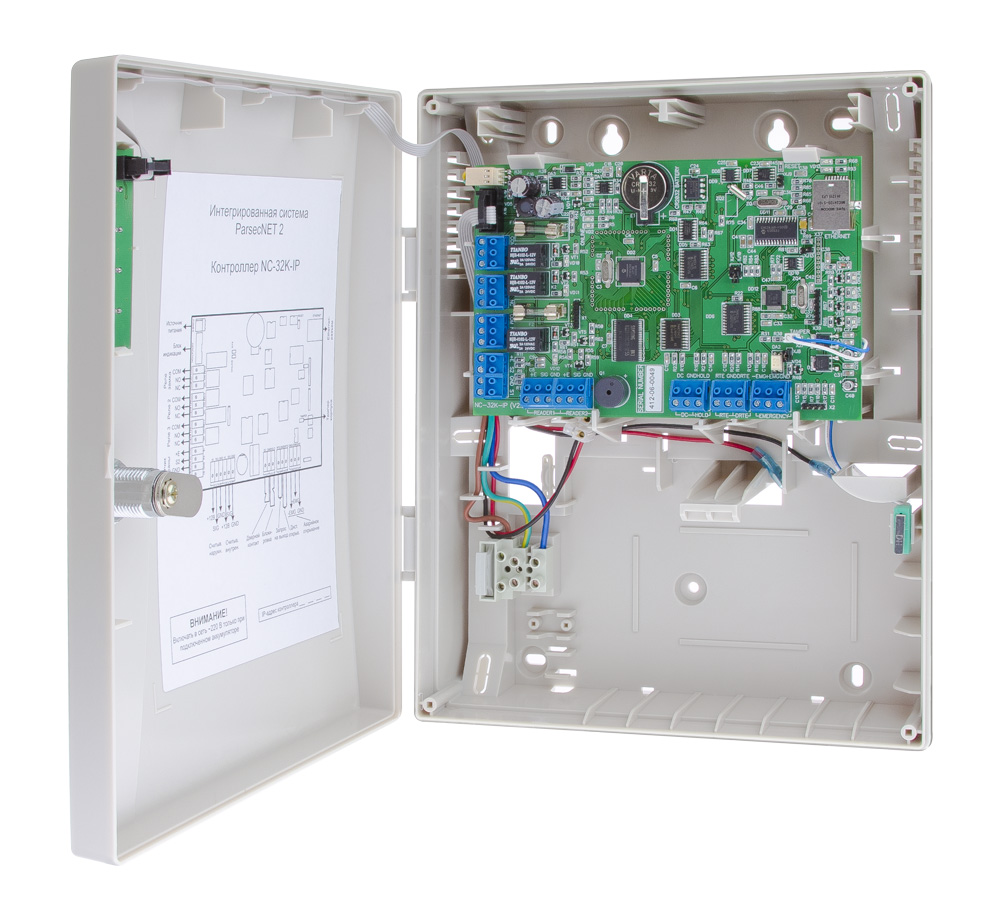 Контроллеры NC-32K-IP поставляются в пластиковом корпусе с источником питания и местом для аккумулятора резервного питания.